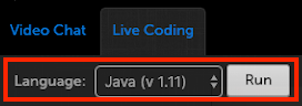 In Live Coding, you or the candidate can pick the CodeVue language to use. After the code is input, you or the candidate can click Run to run the solution.