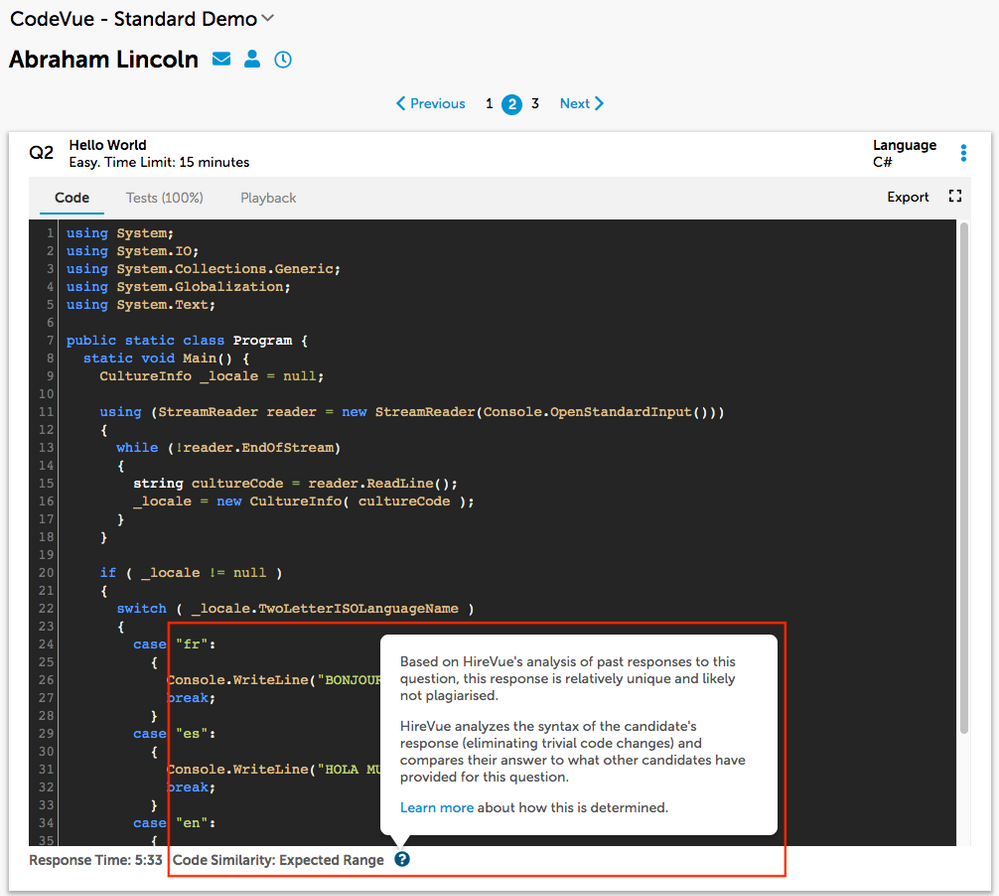 Internally, we calculate a numeric score based on the entire set of code submissions in the system. The lower the numeric score, the more similar it is to other code submissions for that same challenge and language. Inversely, a higher numeric score indicates that the code submission is very different from the others that HireVue has received for that challenge. We categorize Code Similarity into three values: