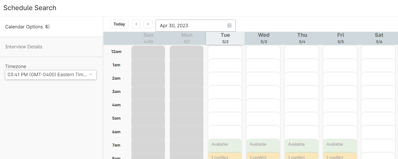 Use Schedule only when external calendar(s) show availability to ensure the interviewer’s external calendar is being checked. If this is unchecked, the interviewer’s calendar is not considered when scheduling.