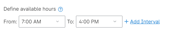 Use Define available hours to control the hours that candidates can schedule an interview. Click the + Add Interval option to add more restricted hours. The duration of the interview must fit within this timeframe.