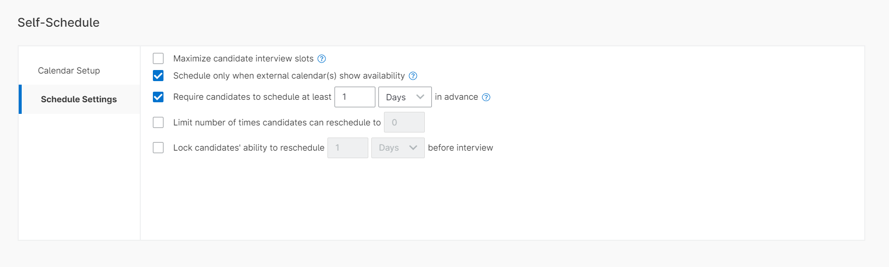 In Self-Schedule Calendar Setup you can edit the available days of the week, hours, and available dates. In the Schedule Settings, you can check Maximize candidate interview slots, schedule only when external calendar(s) show availability, require candidates to schedule a certain amount of days in advance, limit number of times a candidate can reschedule and lock candidates ability to reschedule a a certain amount of days before their interview.