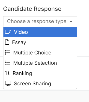 Screen Sharing will require candidates to share their screen when answering the question. The prep time for this question type is unlimited, however a response time limit can be set.