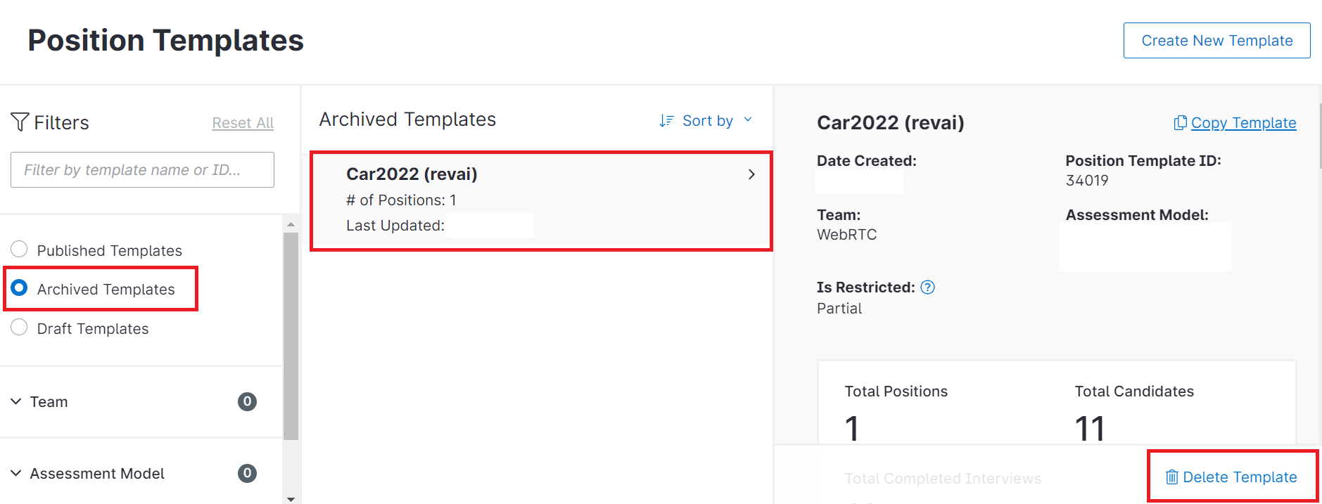 8. To delete a position template, click Archive Template at the bottom of the template editor, then go to Archived Templates, select the template and click Delete Template.