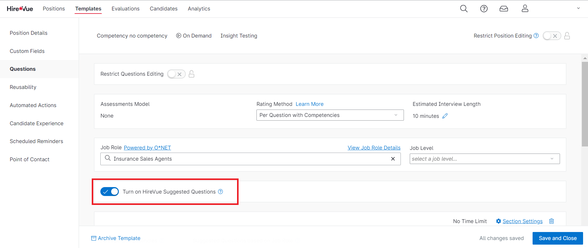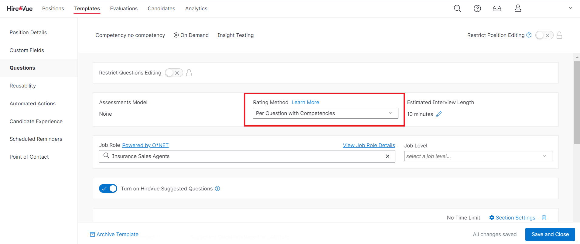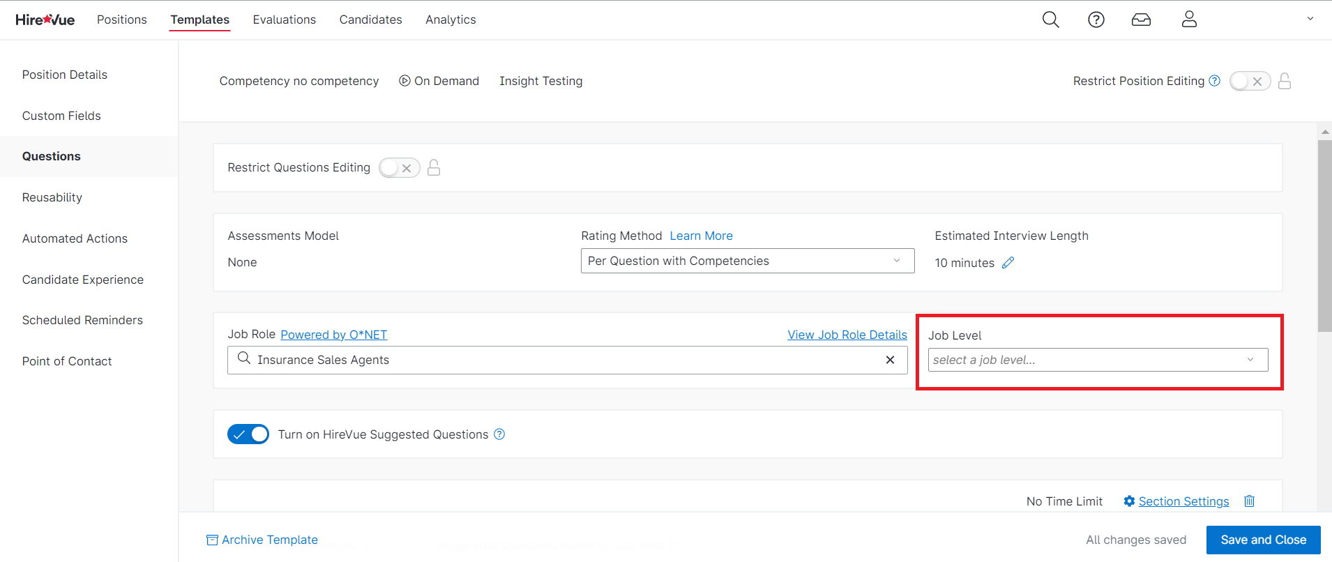 In the Questions tab click the toggle switch for Turn on HireVue Suggested Questions. This will turn on the Evaluator Rating (Per Competency), Job Level, and Job Role settings.