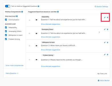 Please note: While users have the ability to edit questions, HireVue's recommendation is to leave the questions as-written. The questions have been created by IO psychologists and other third parties to ensure they are fair for all candidates and properly address the selected competency.