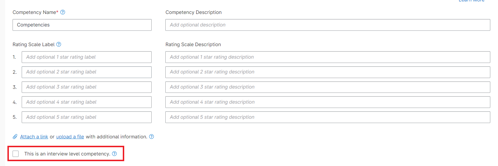 Below the rating scale labels there is a checkbox that says “This is an interview-level competency”. By selecting this checkbox you set this custom competency to be an interview-level competency. An example interview-level competency is communication. An Interview-level competency is used to evaluate a candidate’s performance across an interview and will appear in the evaluator on every competency-based question. For this reason you cannot add questions to an interview-level competency.