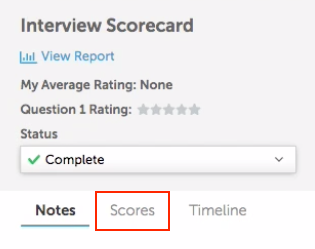 To the right of the interview question is the Interview Scorecard. Click on the Scores tab to see the Average CodeVue Test Score for the candidate.