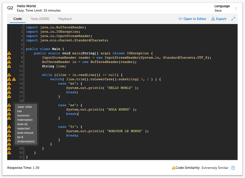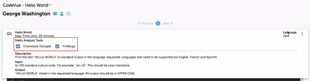 Static Analysis Tools provide information to highlight possible coding errors or best practices the candidate could have used when completing their CodeVue challenge. Using these tools, evaluators can see which programs are used to check the candidate's solution. Each language has their own static analysis tool. This feature is currently supported for Java, JavaScript, C, C++, C#, Python 2, and Python 3.