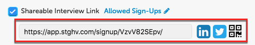 The shareable interview link feature is available for all interview types (On Demand, Live Video, On Site, Phone, and Event). When the shareable interview link is enabled, interviewing candidates can sign up for the interview using an auto-populated link.