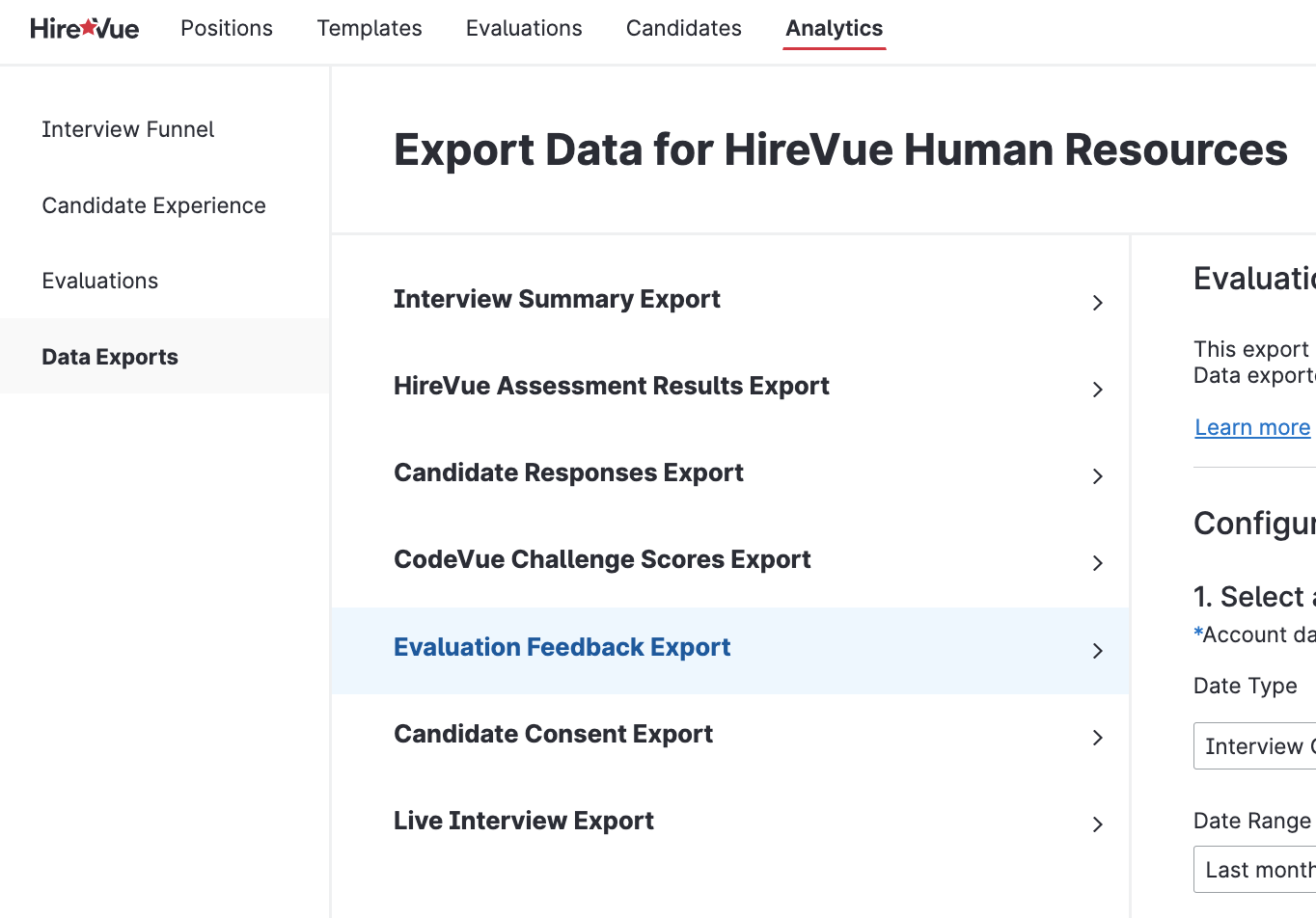 The Evaluation Feedback Export allows users to export interview evaluation data for all interview types which may be used to drill into individual evaluator feedback left on a candidate's interview or perform custom analysis to identify trends, patterns, and insights about an evaluator's behavior.