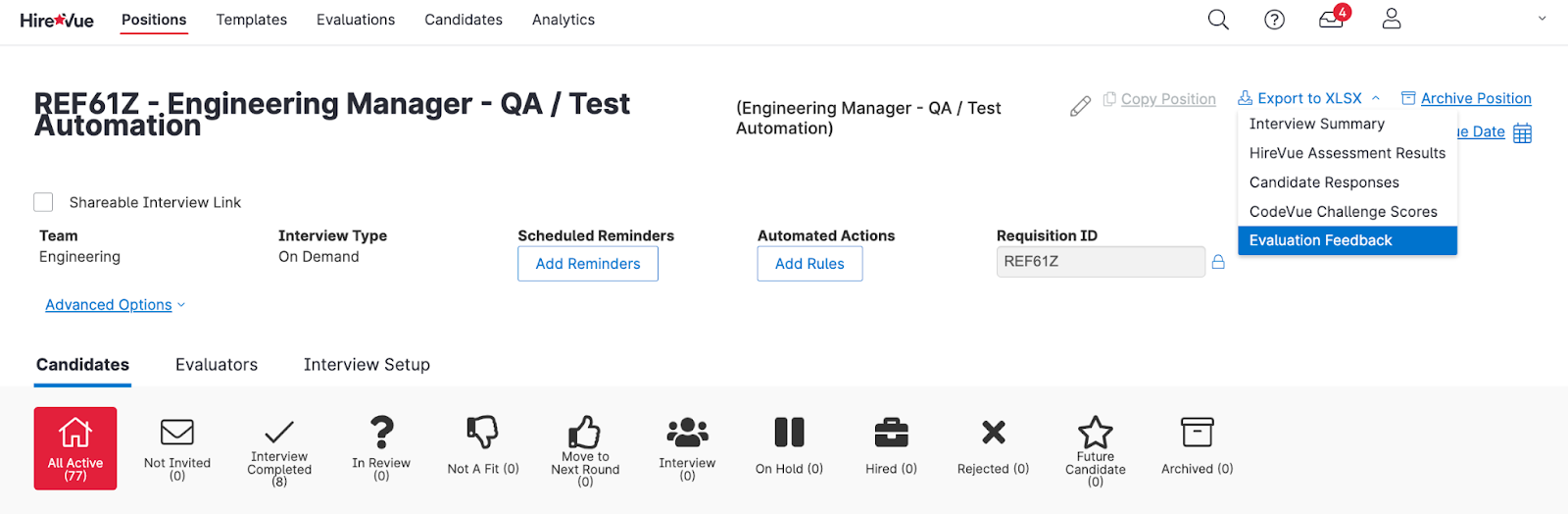 - You can also find this report on the Positions page by clicking into an active position and choosing Evaluation Feedback from the Export to XLSX drop-down menu.
