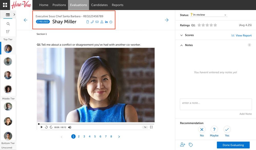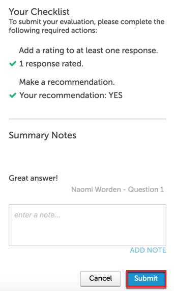 To submit the evaluation, click Done Evaluating at the bottom of the Interview Scorecard.