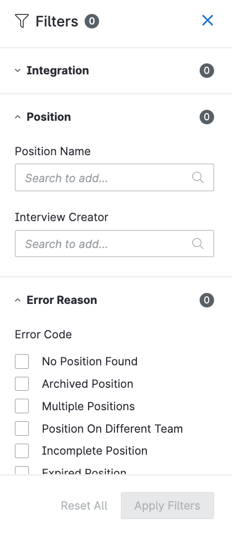- Error Reason: The name of the integration error (See Overview of Integration Errors for information on each type of error and troubleshooting steps)