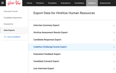 The CodeVue Challenge Scores Export allows users to export data on programming challenges to gain deeper understanding of an individual candidate's programming ability or perform custom analysis to identify trends, patterns, and insights across all candidates taking the assessment.