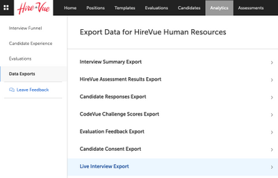 - Navigate to the export by clicking Analytics, choosing Data Exports from the menu on the left then selecting Live Interview Export.