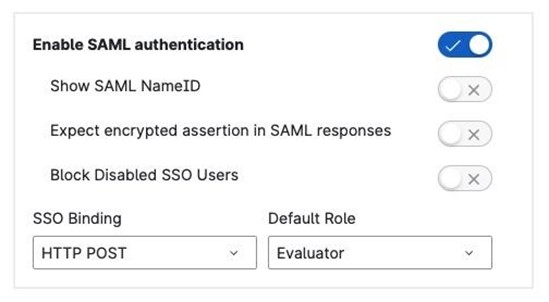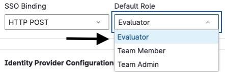 The Default Role setting applies to users that are auto-provisioned by the SSO workflow. By default, these users are granted the basic role of Evaluator (recommended). Auto-provisioned users can also be assigned to Team Member or Team Admin roles.