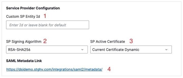 A sample SP-Initiated authentication configuration is displayed in the image below. Populate the required fields for (1) IdP Entity, (2) IdP POST URL, and the (3) IdP signing X.509 certificate provided in Base64 format as appropriate for your use case.