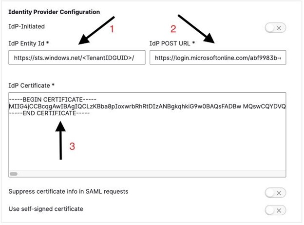 A sample SP-Initiated authentication configuration is displayed in the image below. Populate the required fields for (1) IdP Entity, (2) IdP POST URL, and the (3) IdP signing X.509 certificate provided in Base64 format as appropriate for your use case.