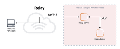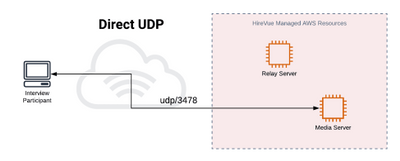 HireVue Live uses WebRTC with ICE (Interactive Connectivity Establishment) to provide multiple methods of connecting to a media server. The most frequently used methods are Direct UDP and Relay which are both depicted below. Relay connections are only used when the client is unable to establish a Direct UDP connection due to client network rules.