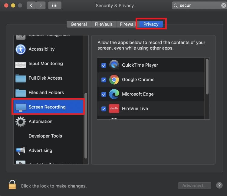 If you’re completing a Live interview on an Apple computer, you may need to update your computer's security settings to allow screen recording in the internet browser. Please follow the below steps to update these settings: