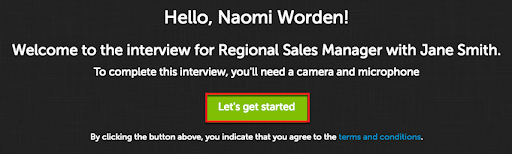 The first page of the interview will list your name, the position title, the candidate’s name, and the required equipment. Click Let's get started to continue.