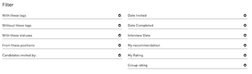 When you click Filter, you will see a list of options to filter, which include by tags, statuses, position title(s), user who invited the candidate, the date invited to interview, the date the interview was completed, the scheduled interview date, your recommendation, your rating, or the group rating.