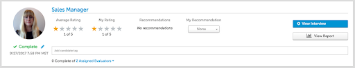 The Positions tab will show any positions that the candidate has an interview for with the interview status, evaluation, candidate tags, option to view interview, or view report.
