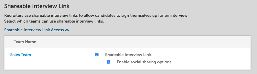 This section allows you to enable shareable interview links, which is a public sign-up link available for all interview types (On Demand, Live Video, On-Site, Phone, and Event). The option Enable social sharing options will allow you to share the link on social networks.