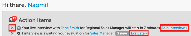 Action Items will list any items that you need to complete like interviews you need to evaluate and Live interviews you need join.