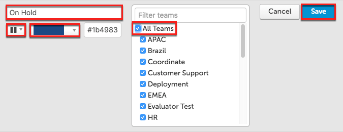 When you edit a custom status you can change the name, the icon, the color of the icon, and choose which teams use the status. If you want all teams to use the status check the box next to All Teams. Always click Save to save any changes.