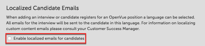 Localized candidate emails allow all emails for the interview to be sent in a selected language. To enable this setting click the checkbox next to Enable localized emails for candidates.
