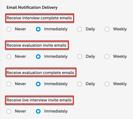 Please note: The email notification delivery options above are the only delivery notifications that can be managed in HireVue.