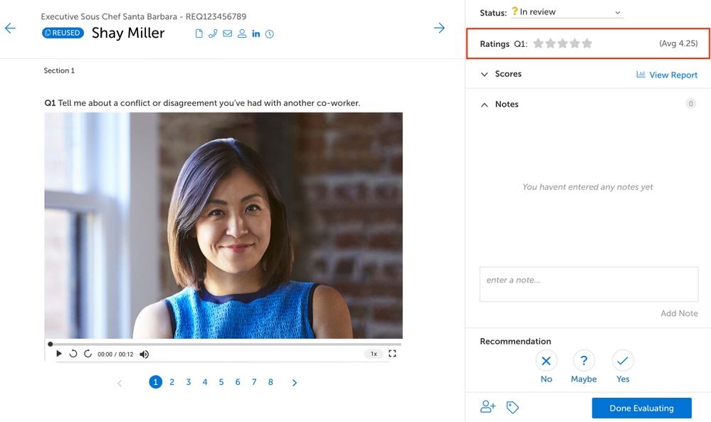 To submit the evaluation, click Done Evaluating at the bottom of the Interview Scorecard.
