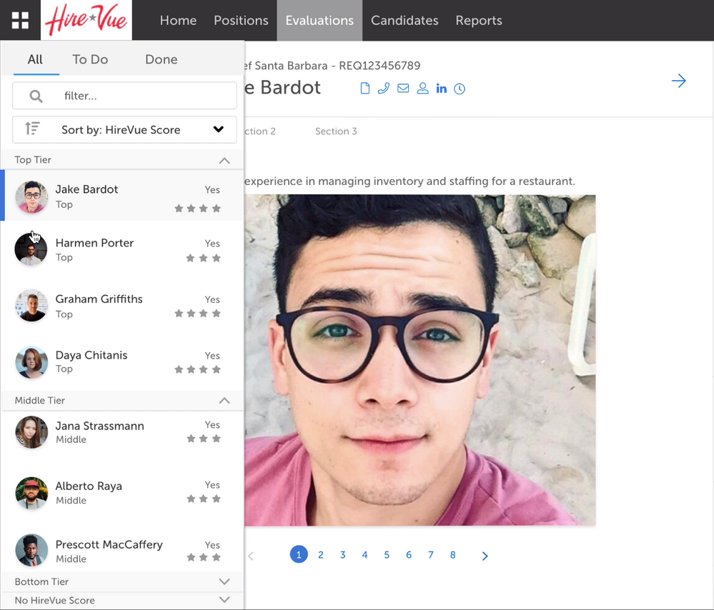 The candidate list shows other candidates the evaluator has been assigned to evaluate for the same position. Candidates can be sorted by Hirevue score, first name, last name, completion date, rating, or recommendation.