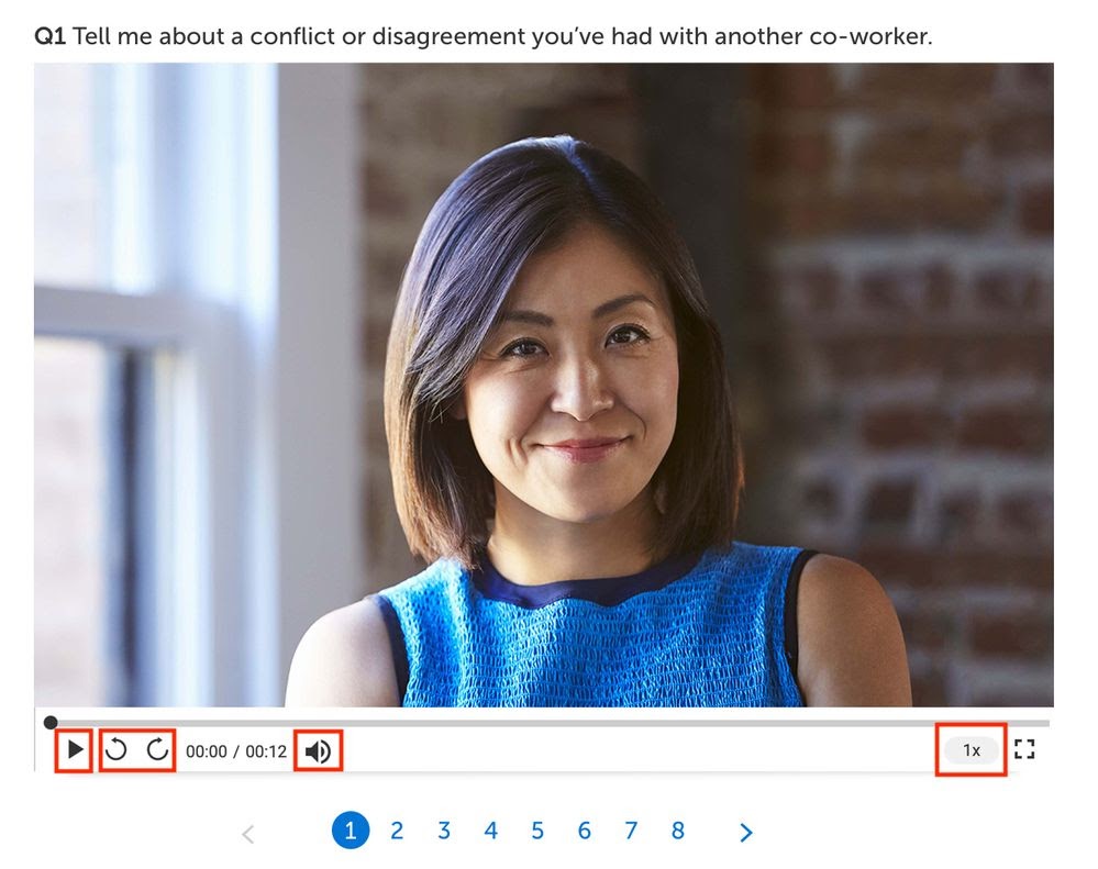 In the video player, the evaluator can play and pause the video, jump backward or forward 15 seconds, adjust the volume, and control the playback speed.