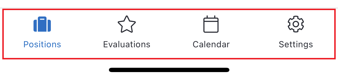 At the bottom of the screen is a menu with Positions, Evaluations, Calendar, and Settings options.