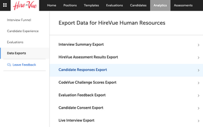 Navigate to the export by clicking Analytics, choosing Data Exports from the menu on the left then selecting Candidate Responses Export.