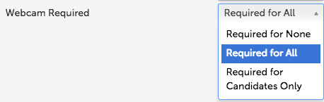 Webcam Required determines whether or not a webcam is required for the interview. You can set webcam required as Required for None, Required for All, or Required for Candidates Only.
