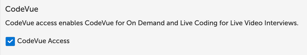This section allows you to enable CodeVue for On Demand interviews and Live interviews. For Live interviews CodeVue will be available on Live Coding. To enable, click the checkbox to the left of CodeVue Access.