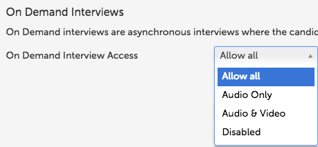 Click in the drop down menu to the right of On Demand Interview Access to control this setting. The options Allow All, Audio Only, Audio & Video, and Disabled may be listed in the drop down. The options are defined below: