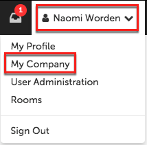 To access the email templates from the main page of your HireVue account, click on your name in the upper right hand corner and select My Company from the dropdown.