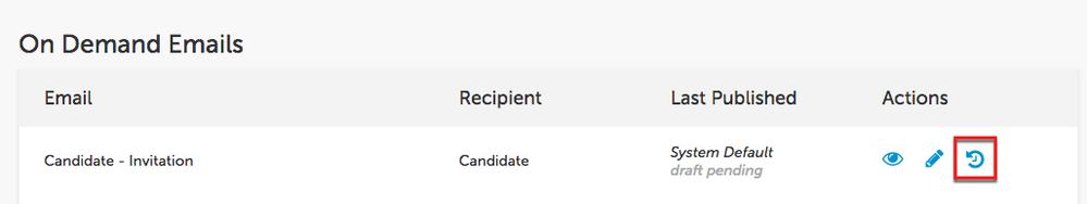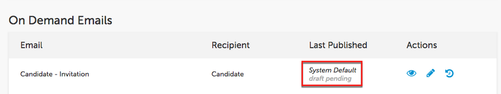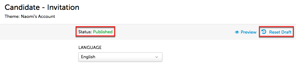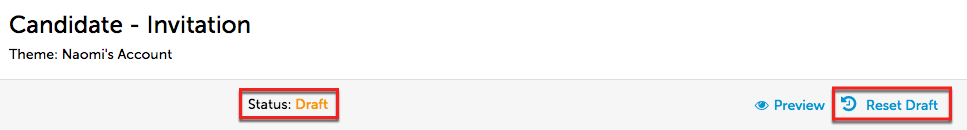If an email template is in draft it will be listed as Draft. If you want to start fresh you can click Reset Draft to reset the template to the original HireVue System default.