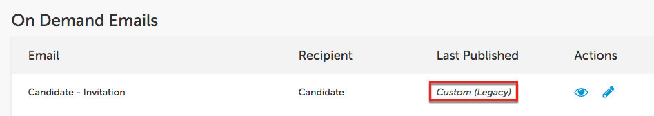 Customized email templates are labeled Custom (Legacy) and they cannot be edited in the new self-service email templates editor. When you use the editor you will start editing with the new HireVue system default template, not your customized email template.