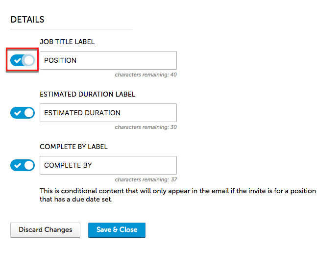 The editable block may also have an option to turn content on or off. Once you make your changes, always click Save & Close. The example below shows conditional content which is content that is conditional upon the settings of the position. For example, if there is no due date for the position, then the Completed By field will not appear in the candidate’s invitation email. When you select the conditional content it will be explained in the editor.