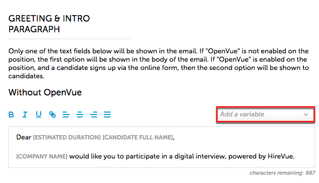 If the editor has text available to edit use the editor box to format your text accordingly. Use the option Add a variable to auto-populate available variables.
