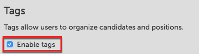 Use tags to organize candidates and positions. To enable, check the option next to Enable tags.
