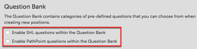 The question bank is a set of predefined questions to use for interviews. Check the box next to one or both of the options (SHL questions and PathPoint questions) to enable the question bank.
