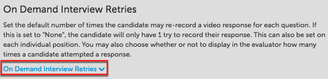 Choose the default number of retries for video questions in a candidate’s interview by team. Click Number of Retries Allowed and select disabled, one, two, three, four, five, or unlimited retries.