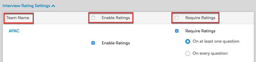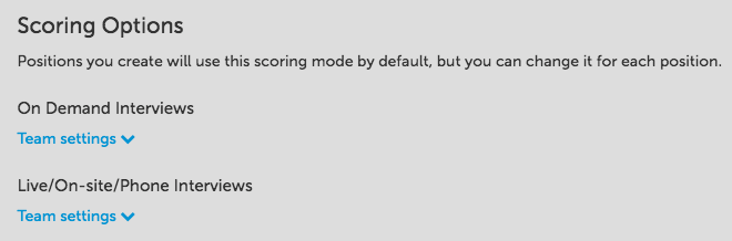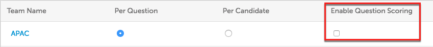 Live/On-Site/Phone Interviews: Set the scoring options are per candidate or per question for specific teams. Per candidate requires evaluators to leave an average rating for the interview while per question requires evaluators to leave ratings for each candidate interview question.