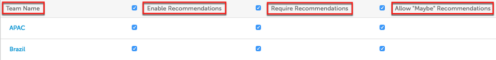 Please note: Check the box at the top of the table in each section to apply the setting to all teams.